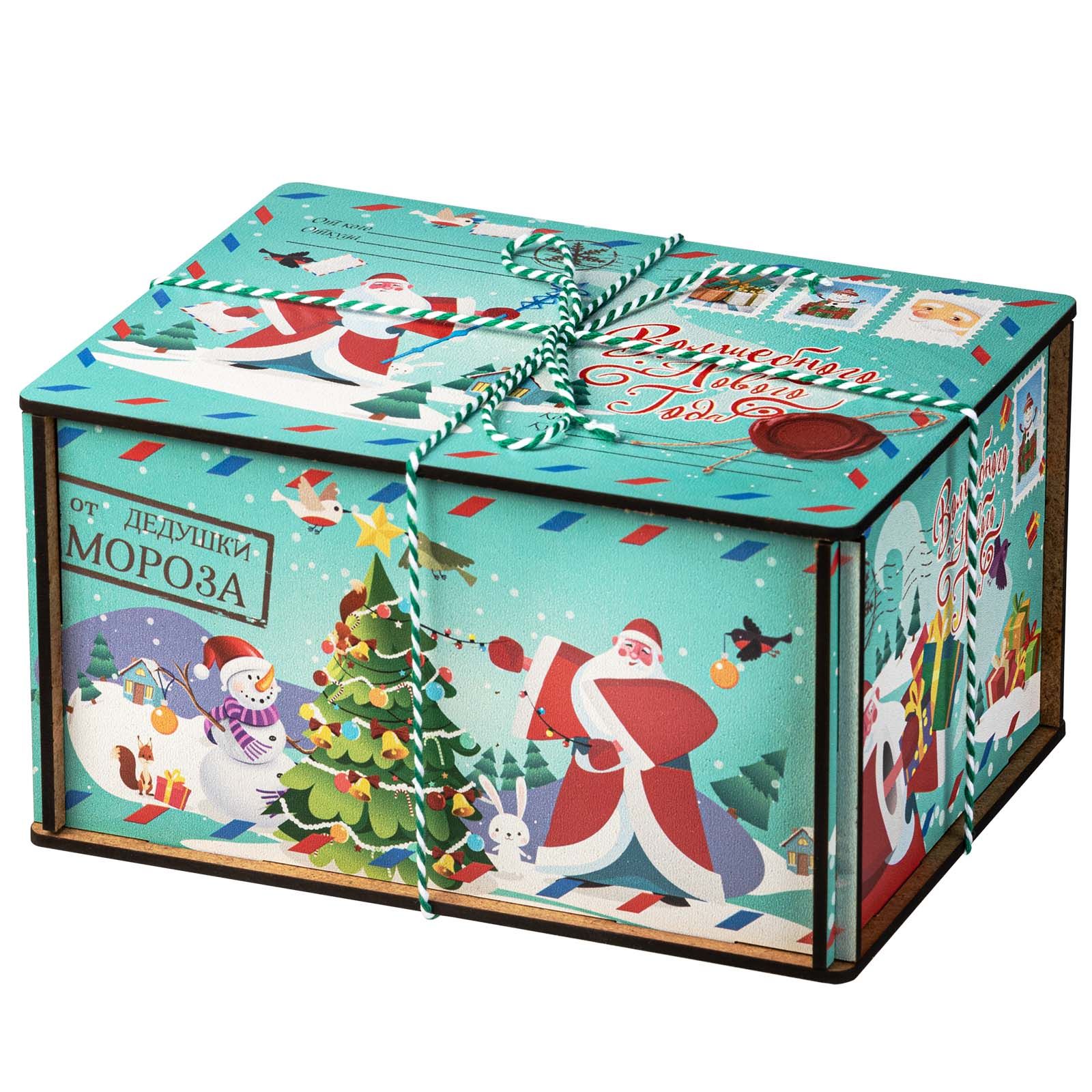 Яркий красочный подарок в деревянном коробе «Посылка Бирюзовая» непременно понравится вам и вашему ребенку. Цветовая гамма цвет морской воды. На рисунке Дед Мороз. По контуру декоры с почтовой символикой. На строках надписи от кого и для кого. Размер упаковки 18*10*13 сантиметров. За счет универсального сюжета на упаковке данный подарок можно подарить как ребенку, так и взрослому. Сладкий набор весом 1500 граммов непременно порадует ваших любимых сладкоежек.Подарок имеет сертификат качества, с которым вы можете ознакомиться на нашем сайте. Этот и другие варианты посылок смотрите в разделе дерево.
